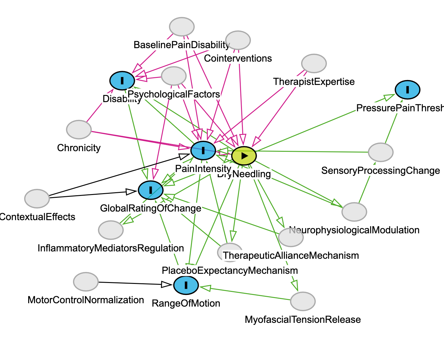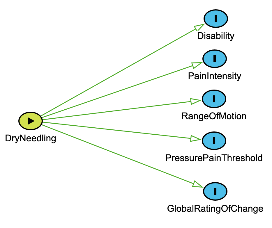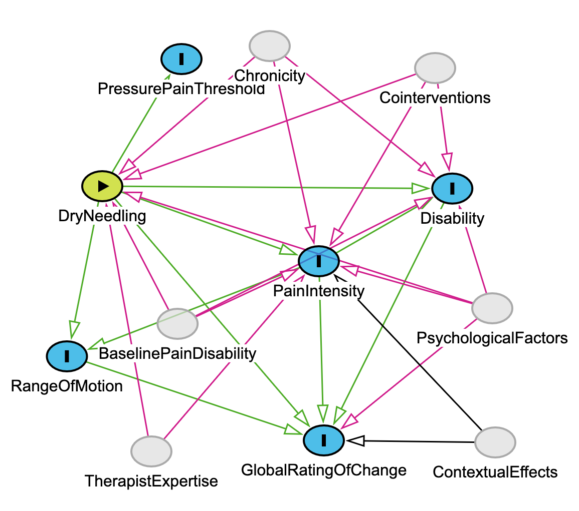 We begin by identifying the exposure (DryNeedling) and several measured outcomes reported in the meta-analysis (e.g., PainIntensity, Disability). This reflects the initial stage of model building where we ask: What was measured, and what’s the assumed causal effect?